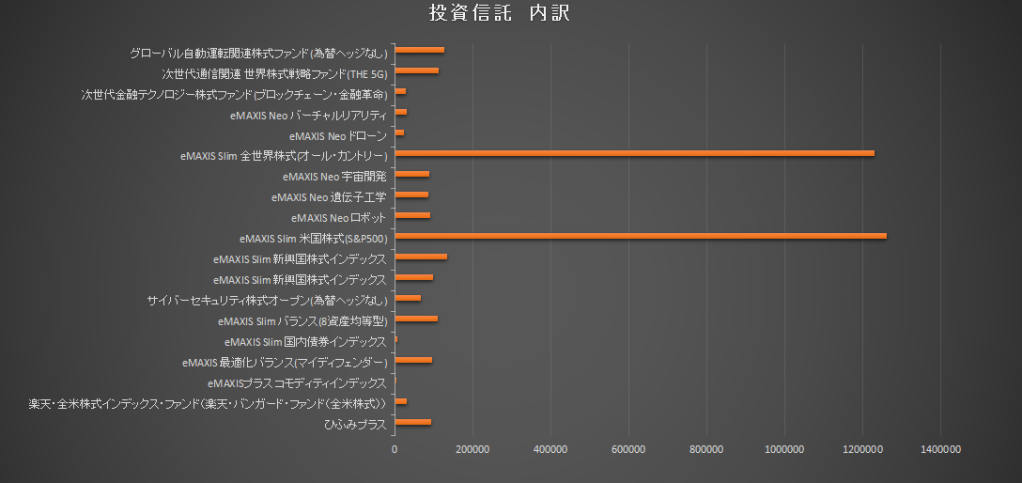 投資信託の内訳です。 投資信託はeMAXIS Slim米国株式(S&P500)とeMAXIS Slim 全世界株式(オルカン)の保有比率が大半を占めています。その他、eMAXIS Neoシリーズを趣味で保有しています。このシリーズは経費率は2%近く高いものもありますが、バーチャルリアリティや宇宙開発などは利益率が50%以上になっているものもあるので保有しています。僅かですがこれから保有率を増やす予定の国内債券インデックス、コモディティインデックスも保有しています。